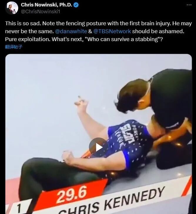 在2023年1月的推文中,神经科学家、前职业摔跤手诺温斯基(Christopher Nowinski)分享了比赛中令人心痛的一幕。参赛者肯尼迪被击倒在地,他的双臂呈现“击剑姿势”——这种不自然的姿势正是脑震荡的典型表现。